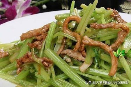 1、芹菜炒肉。芹菜是冬天应季蔬菜,营养丰富,中医认为,芹菜性甘凉,具有清热、利尿、降压、祛脂等功效。由于它们的根、茎、叶和籽都可以当药用,故有“厨房里的药物”、“药芹”之称。最家常的做法是芹菜炒肉,荤素搭配,真是色香味俱全呢。