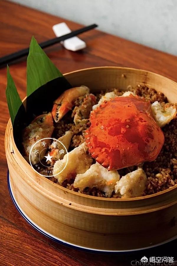 3、把膏蟹治净后,斩成八块纳盆,加姜片、葱结和料酒腌渍10分钟。另把蟹呈整形地摆放笼中糯米上,待上火蒸15分钟至熟以后,取出来淋几滴熟菜籽油,稍加点缀即成。