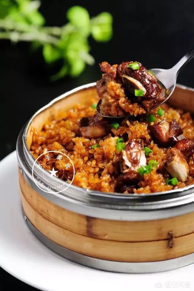 2. 调料兑匀成汁酱,2/3汁酱拌匀排骨用码斗定碗,1/3汁酱和腊肉丁拌匀糯米填入排骨中,蒸制50分钟;