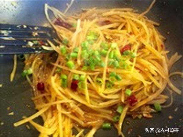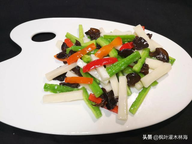 做法:以上主料均切条,锅下水烧开放入主料焯水捞出过凉,锅放油烧热倒入主料调味快速翻炒勾水芡粉淋明油出锅装盘。
