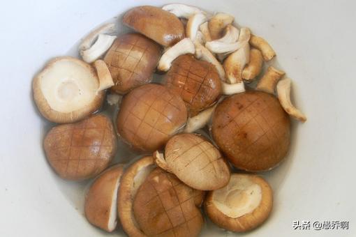 1、新鲜香菇备好,把香菇的伞盖和柄分离,伞盖上用刀成井字形状划口,多划几道,香菇柄一分为二,不要圆柱形。