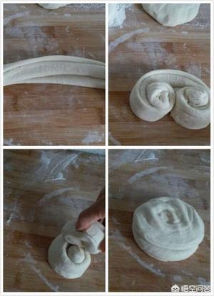 分成均等的面团,用擀面杖擀成圆形,不要太薄,放入油一层,食盐适量,喜欢葱花的可以放入葱花,均匀的撒在上面,五香粉也放一点,最后呢,从一头轻轻卷起,卷的时候,记住边卷边压住边缘,卷完之后呢,盘起来,就像我们小女生盘头发一样,一圈一圈的,最后用擀面杖轻轻擀平,不要太薄,太薄了做出来不好吃,还硬。