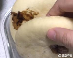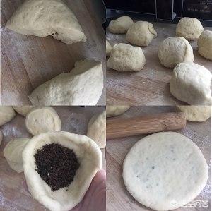 发酵完成后分切均匀小块,把准备好的馅料包入,然后擀平为小圆饼模样。