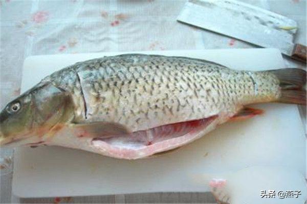 2.鲤鱼一条,去鳞、去内脏清洗干净。在头和尾部的位置各切一刀,两面相同,剔除鱼腥线,用手指甲捏住,往外抽动,去除醒线。
