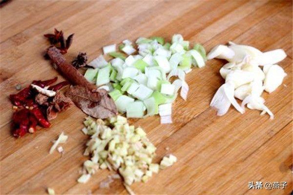 1.葱、姜、蒜、干红椒、八角、花椒准备好。