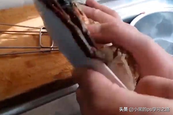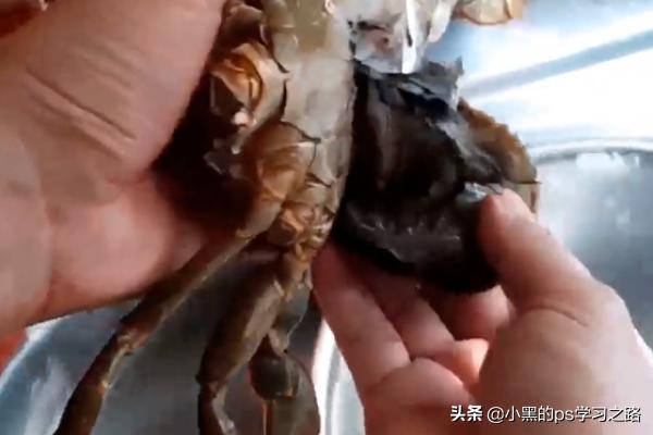 1.用毛巾垫住手,将螃蟹的后壳用力打开。