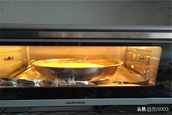 烤箱预热好,把面糊倒入模具里面,震一下,让里面的气泡震出来,放入烤箱烤30分钟。烤盘放最下一格,上下都要烤,定时间为30分钟,时间到,美味的蛋糕就坐好啦