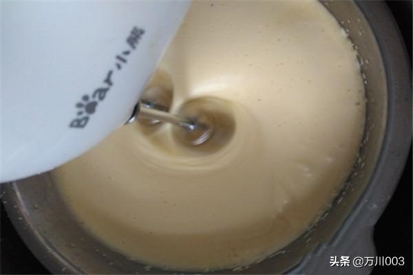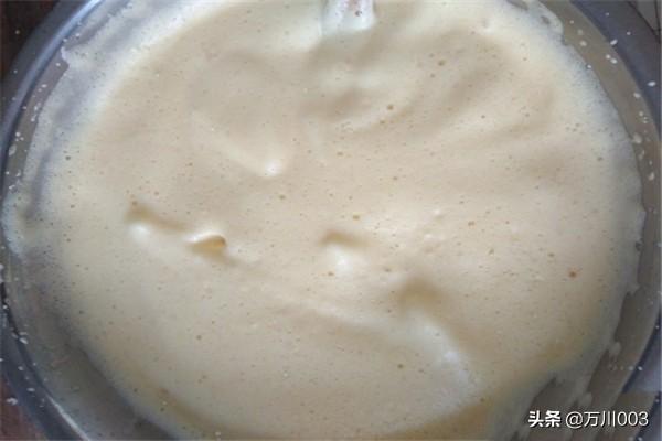 用打蛋器把鸡蛋液打发,用最快速的打八分钟,在打的过程中,分三次把白糖加进去,当打的能提起一些,掉下来没有立刻消失就可以啦