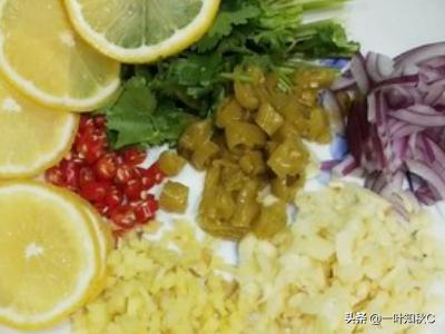 4、准备配菜,蒜末,姜末,小米辣,泡椒,洋葱,香菜,柠檬5片,如下图;