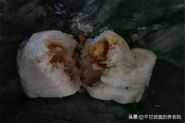 5、用两片粽叶编成斗笠状,上下各一片叶子,中间折开即成斗笠状,放一半米,一片肉,一个蛋黄,再盖上另外一半糯米,一个粽子约3两米,压实后先包好侧边的叶子,再包头尾的叶子,两手捏紧,用麻绳绑好,一个粽子就做好啦;