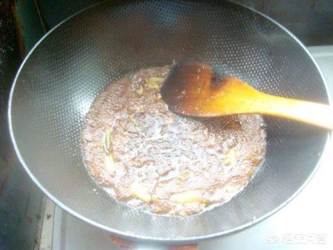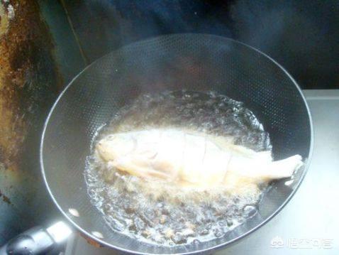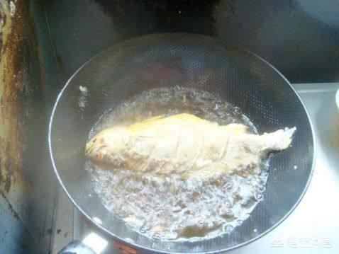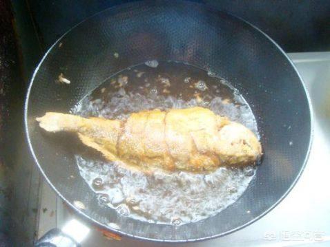 3.锅中放油烧至七成热,手提鱼尾,先下鱼头稍炸,再慢慢将鱼身放入油中炸制。