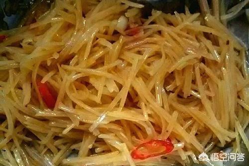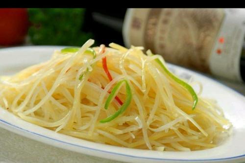 酸辣土豆丝配料:土豆,青椒(随个人喜好),盐,醋,小红辣椒,花椒,大蒜,生姜,葱,味精(随个人喜好)酸辣土豆丝做法:1.把土豆去皮,切丝,边切边用冷水浸泡土豆丝,去淀粉,可以让土豆脆,而且女孩子吃不会长肥;如果想配点青椒或者红椒都可以,看个人喜好2.切大蒜,生姜,大葱切段3.热油锅,放入小红辣椒,花椒,大蒜,生姜,大葱段爆香4.放入土豆丝,翻炒,然后加入盐,醋,如果喜欢味精的,关火以后放入,最后加点小葱,会更香!炒土豆丝材料(4人份)中药:花椒1小匙生姜1片(切丝)土豆400克胡萝卜5cm小葱10根酒2大匙盐1小匙砂糖适量油适量做法:1、土豆削皮后,切成火柴棒状的细丝。2、把1放在水中冲洗一下,放在竹箅上滤去水。3、胡萝卜也切成同样的丝。4、小葱切成葱花。5、油入锅中,加热,入土豆、胡萝卜、生姜、炒透明后撒入花椒。6、然后再加入酒、盐、砂糖混匀。7、盛入盘中,撒上葱花即可。