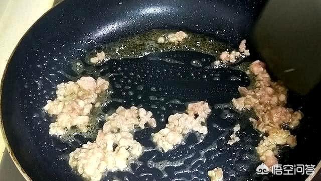第四步:起锅放入适量菜籽油,油五成热,放入肉末再加入少量料酒炒散,变色即可盛出备用;