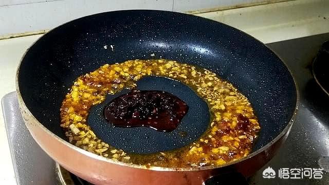 第五步:再在锅中放入适量菜籽油(油量稍多,豆腐比较吃油),油热先放入姜蒜末炒香,接着再放入豆瓣酱炒出红油,放入豆豉炒香,喜欢吃麻味的还可以加入几粒花椒;