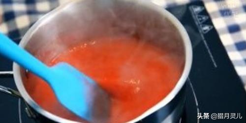 9、滤去草莓果酱的浮沫,熬至浓稠,倒出来冷却备用。