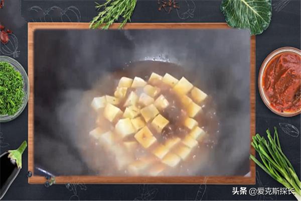 下入豆腐,加适量老抽、盐、鸡精、白糖。