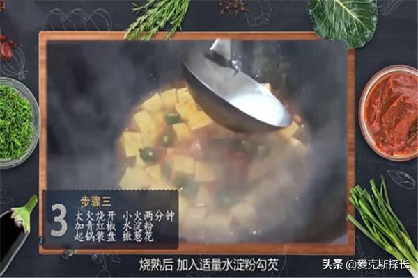 大火烧开,小火两分钟,加青红椒、适量水淀粉,勾芡。