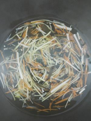把断生后的冬笋丝、胡萝卜丝、木耳丝捞出控水备用。