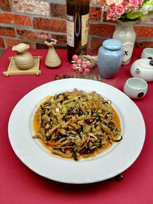 锅内加入适量植物油,烧至三四成热时,加入葱花、姜丝、蒜末爆香。开小火,倒入适量红油豆瓣酱,炒出红油。倒入肉丝、胡萝卜丝、水发木耳丝、冬笋丝、泡椒快速翻炒。调入适量蚝油、白糖、料酒、盐、生抽、味精、鸡粉、老陈醋,翻炒均匀。水淀粉勾玻璃芡,淋花椒油、麻椒油、辣椒红油适量。再次洒大葱花,即可盛盘。