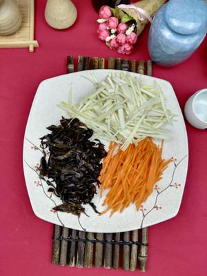 把冬笋丝、木耳丝、胡萝卜丝焯水断后。