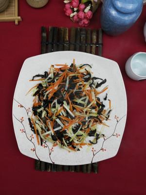 1.木耳用水泡发后切丝,胡萝卜洗净切丝,青椒洗净切丝。