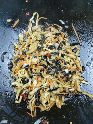 再倒入青椒丝、胡萝卜丝、木耳丝、姜、葱、蒜等,大火快炒。
