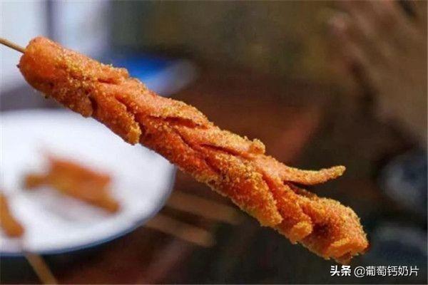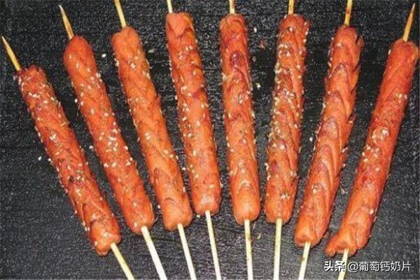 还有好吃的火腿肠,我们先把火腿肠上用刀划出一道道的花刀,放入油锅中不断翻动,当火腿肠稍微变红之后拿出来控控油撒上调料即可。