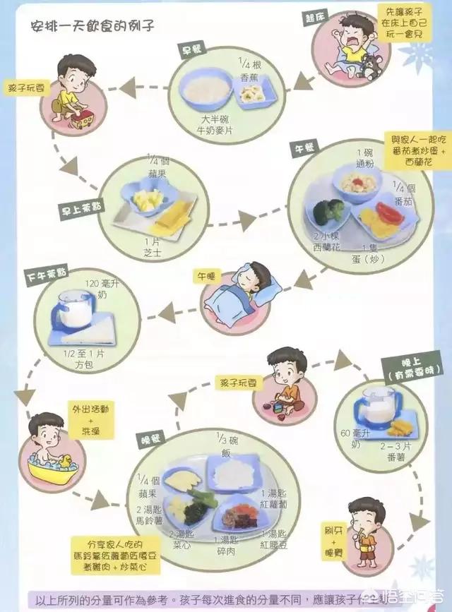 宝宝胃口小,每次吃的分量不多,需要安排早中晚3次正餐和2-3次点心。正餐后2-3小时吃些健康的点心,可让宝宝补充热量和营养。最好让宝宝与家人一起吃午餐和晚餐,吃饭时间尽量安排的规律和固定。