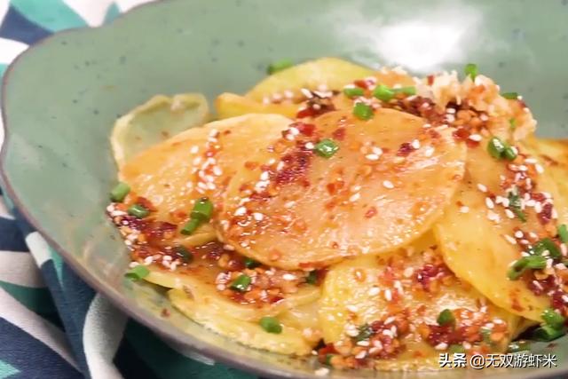 8,把调好的料汁淋在土豆片上,撒上蒜末,葱末即可。如下图: