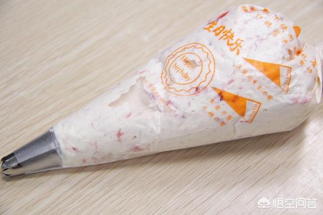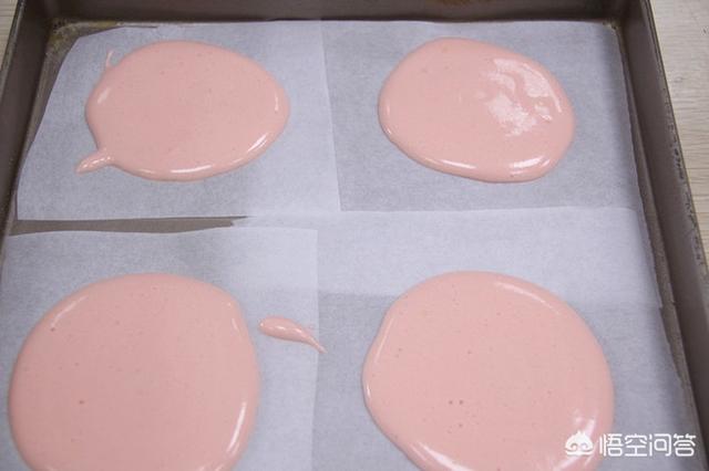 加入一滴粉红色素,把面糊调成粉红色,用裱花袋装上面糊,挤出螺旋形在烤盘上。