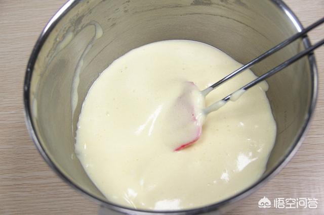1、牛奶和玉米油,搅拌成浓稠液体,俗称乳化,乳化的作用,可以减少水粉分离的现象,让面粉更好的融合,蛋黄糊细腻。