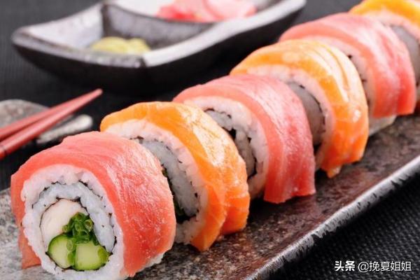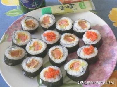 第4步 切寿司装盘。卷好之后就用刀均匀地切成一段一段的就可以装盘。