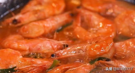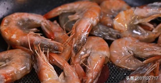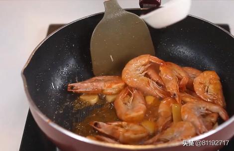 5、接着下大虾煎炒两面变红,开大火下葱丝一起炒约十五秒左右出香气放黄酒,酱油炒出香气来,接着加一些热水,放白糖、盐和胡椒粉少许炒匀,滴几滴醋提鲜去腥