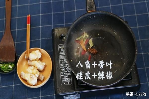 锅中放少许油,烧热,放八角、香叶、桂皮,辣椒翻炒。