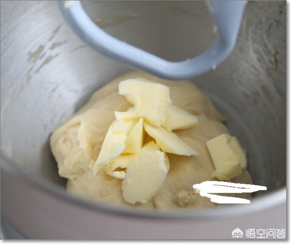 3、加入室温软化的黄油,1档拌匀至黄油吸收,再开3档揉5分钟左右,看到面团全部搅起拍打着揉面缸,面的筋度就起来了,此时可检查一下面团。