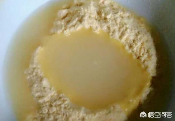 低粉加小苏打混合均匀,在面粉中间挖一个大点的坑。