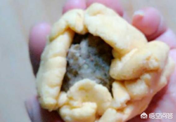 4、捏成一个个小圆压扁把豆沙放中间,如下图所示: