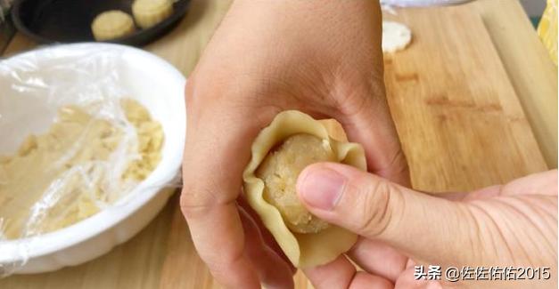 6、月饼皮松弛好后,取出20克,双手摁成饺子皮大小,放进板栗球,用虎口收严即可。