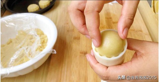 7、月饼收口完成后,还要双手再搓一搓,滚圆,滚光滑。之后放到月饼模具里,压出月饼胚,就可以了。