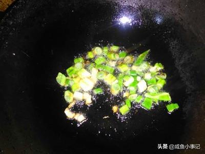 3/5 油锅烧热,加精盐,先炒蒜苗至半熟时盛在碗里;