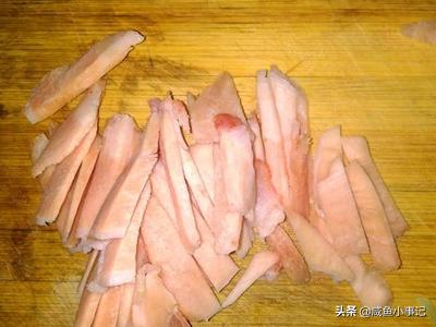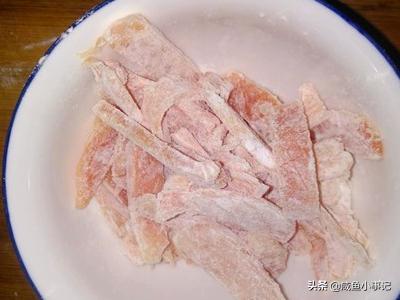3、把五花肉先切成片,然后切成细长方条,加入淀粉拌匀。