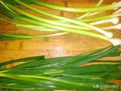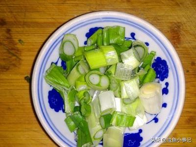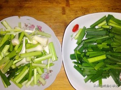 2、把蒜苗去掉外边干的皮和烂的的叶,去掉根,洗净,把茎和叶子部分分开切。由于茎部较粗,用刀在中间切一下。把茎部和叶子部分分别放入两个盘中。(为什么分开放,下面会告诉你)