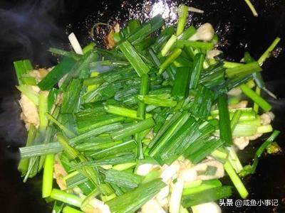 4.放入蒜苗一同爆炒,等蒜苗熟了就可起锅哦