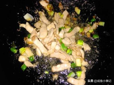 4/5 再烧热余下的油,炒猪肉丝,加入酱油,炒至半熟;