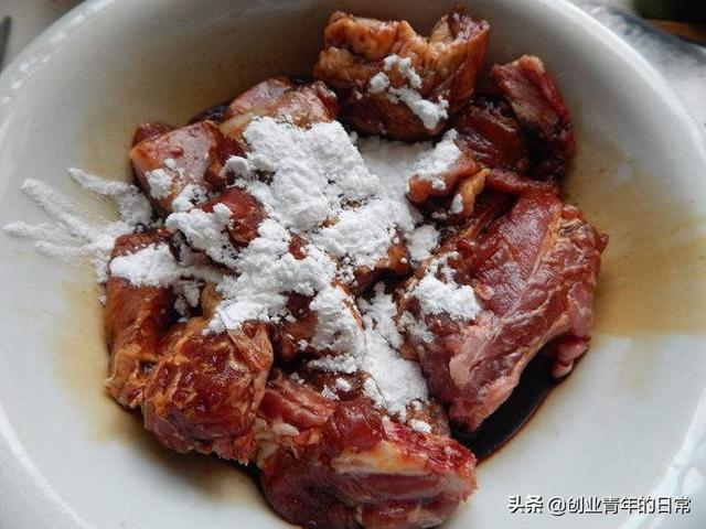 9、排骨腌制好后,倒入少许淀粉水与排骨拌均匀。 淀粉水能锁住排骨的水分,使肉更嫩。(小窍门)