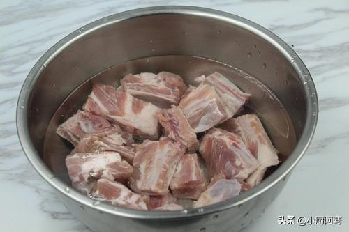 1、排骨必须是新鲜的。 两条小排骨剁成小段,用清水浸泡半小时去血水。 泡完后沥干水备用。