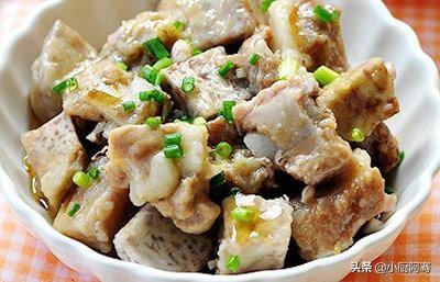 4?将炸好的芋头片放入盘底,铺上腌制好的排骨,锅中水烧开,放入排骨大火蒸十分钟即可。