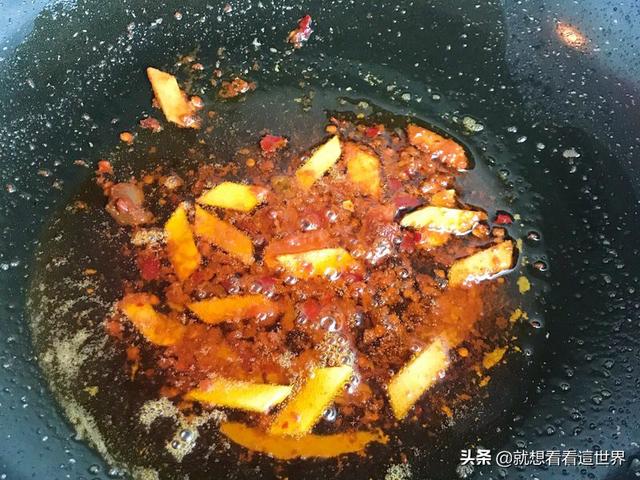 2.锅内放油,暴香姜片后,放入郫县豆瓣炒出红油。