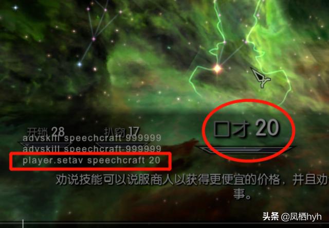 3、再输入秘籍player.setav speechcraft 20,将口才技能降至20级