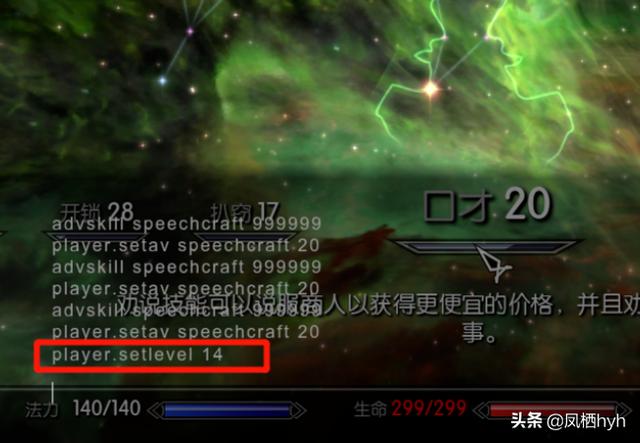 3、再输入秘籍player.setav speechcraft 20,将口才技能降至20级。